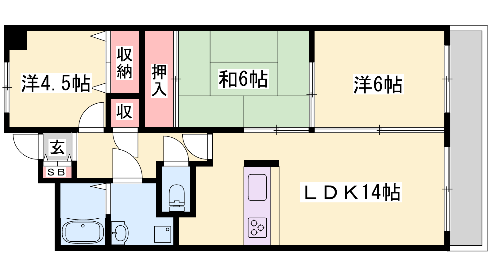 - LDK14帖、洋室6帖、洋室4.5帖、和室6帖