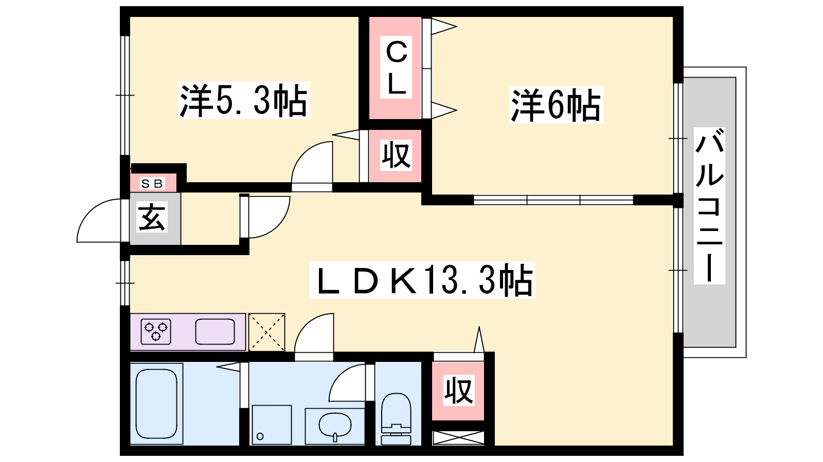- LDK13.3帖、洋室6帖、洋室5.3帖