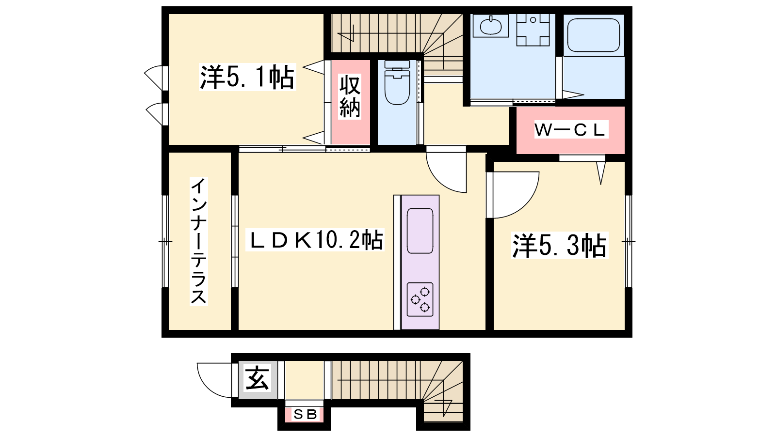 - LDK10.2帖、洋室5.3帖、洋室5.1帖