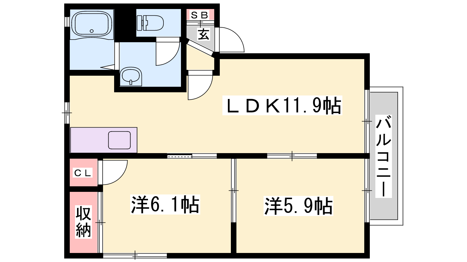 - LDK11.9帖、洋室6.1帖、洋室5.9帖