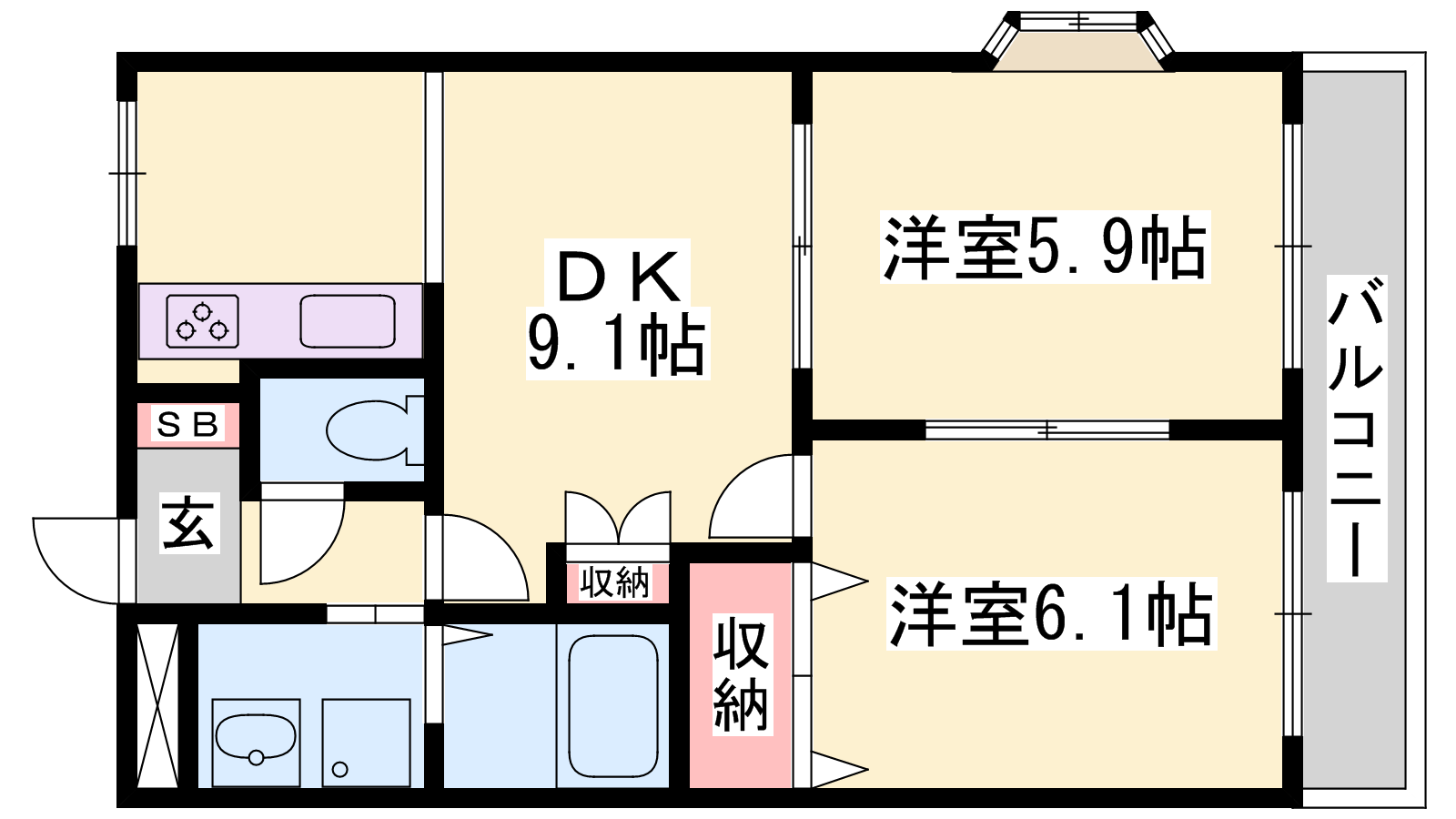 - DK9.1帖、洋室6.1帖、洋室5.9帖