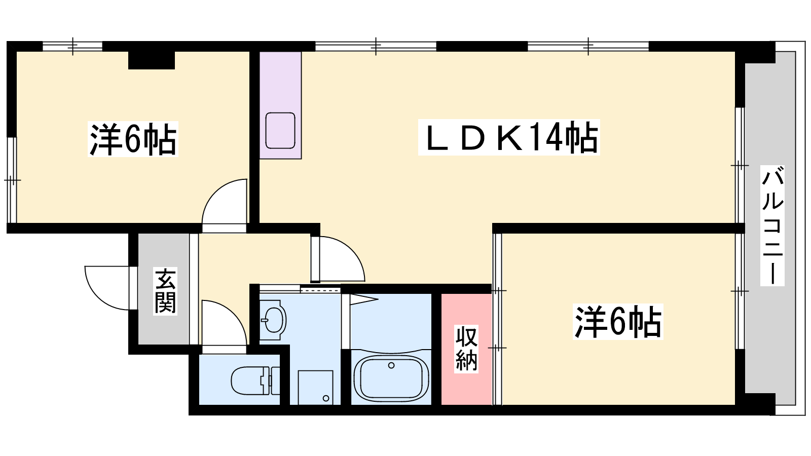 - LDK14帖、洋室6帖、洋室6帖