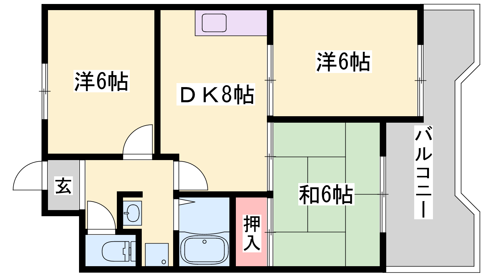 - DK8帖、洋室6帖、洋室6帖、和室6帖