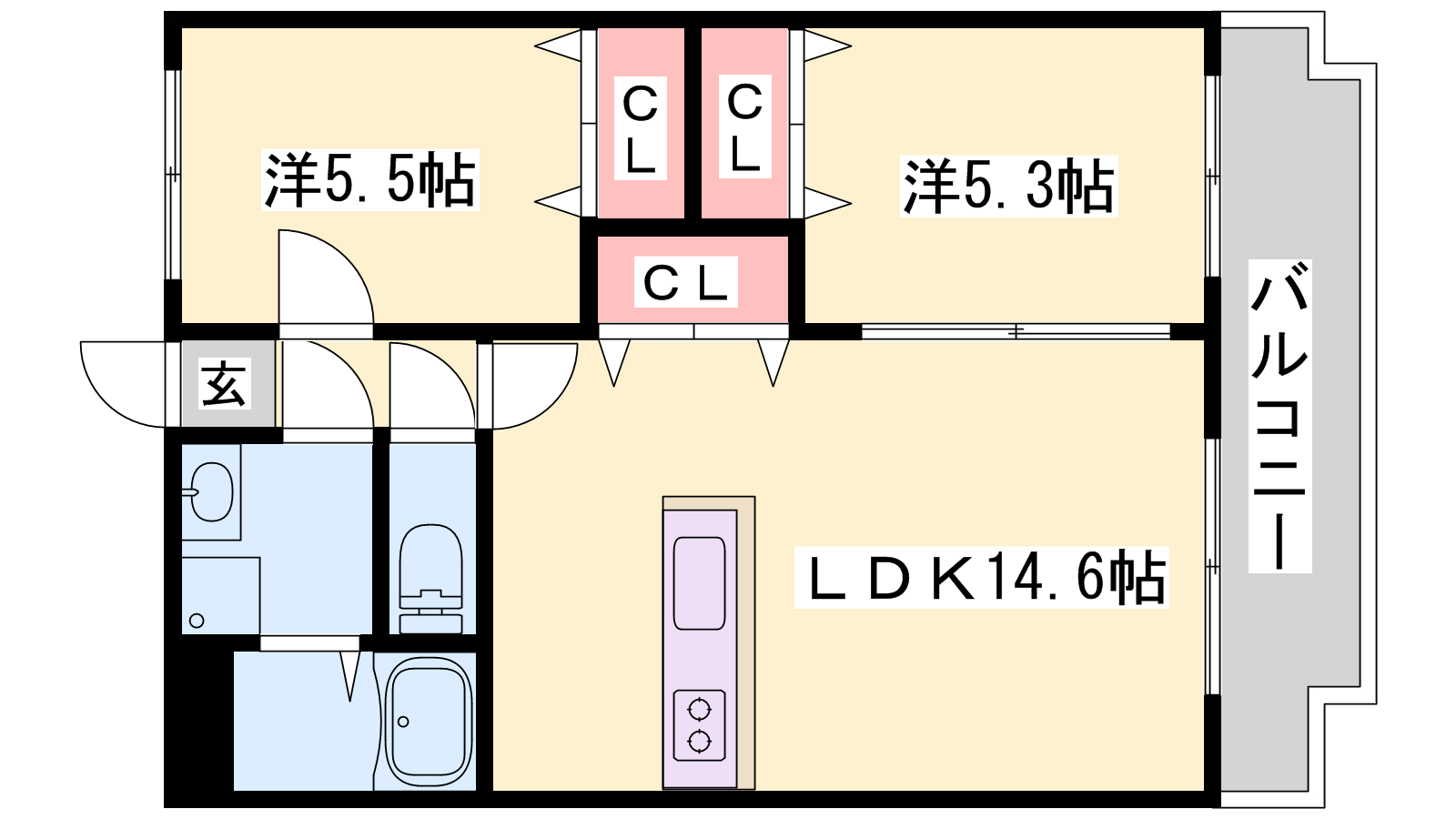 - LDK14.6帖、洋室5.5帖、洋室5.3帖