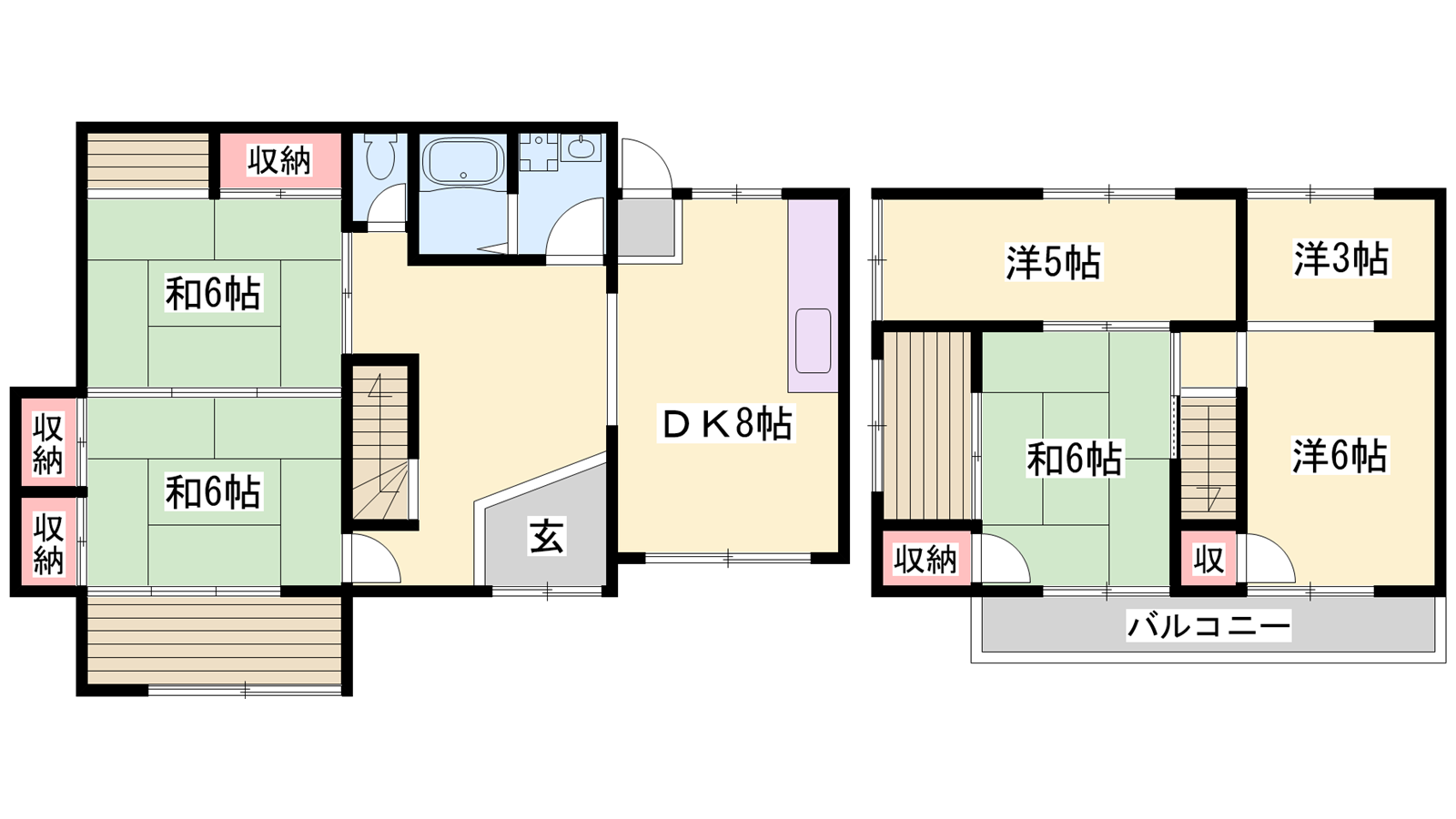 - DK8帖、洋室6帖、洋室5帖、洋室3帖、和室6帖、和室6帖、和室6帖