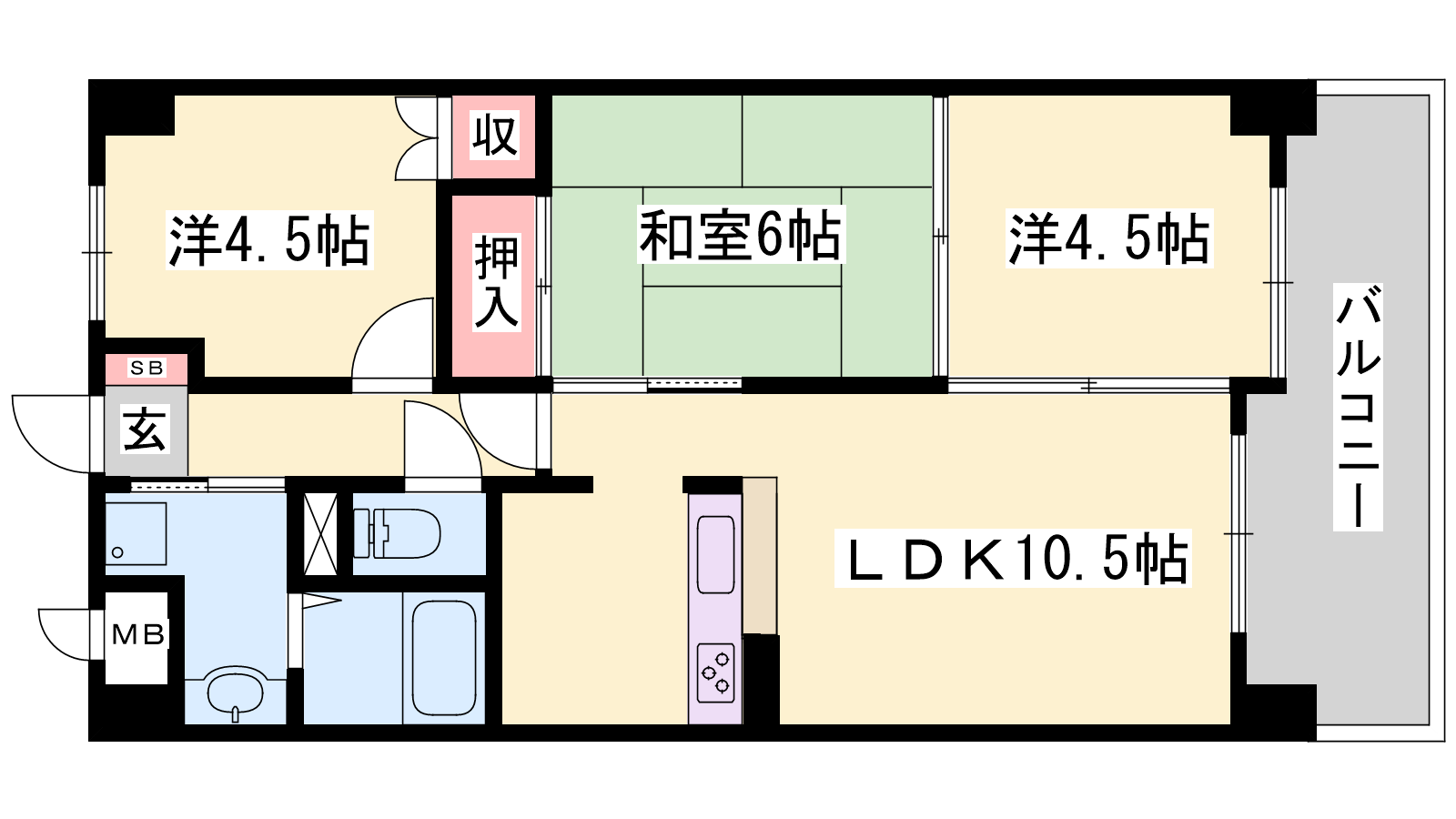 - LDK10.5帖、和室6帖、洋室4.5帖、洋室4.5帖