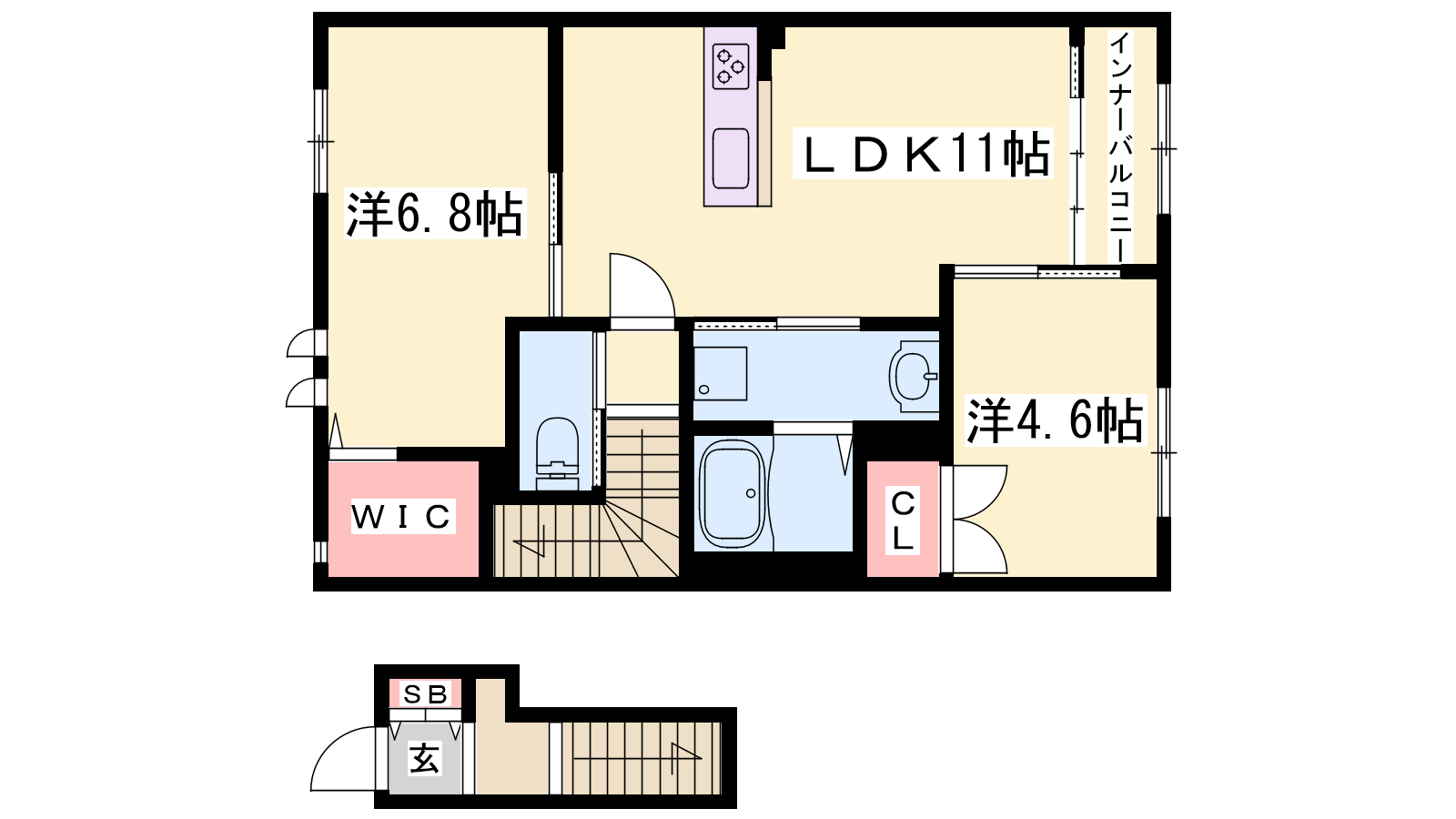 - LDK11帖、洋室6.8帖、洋室4.6帖