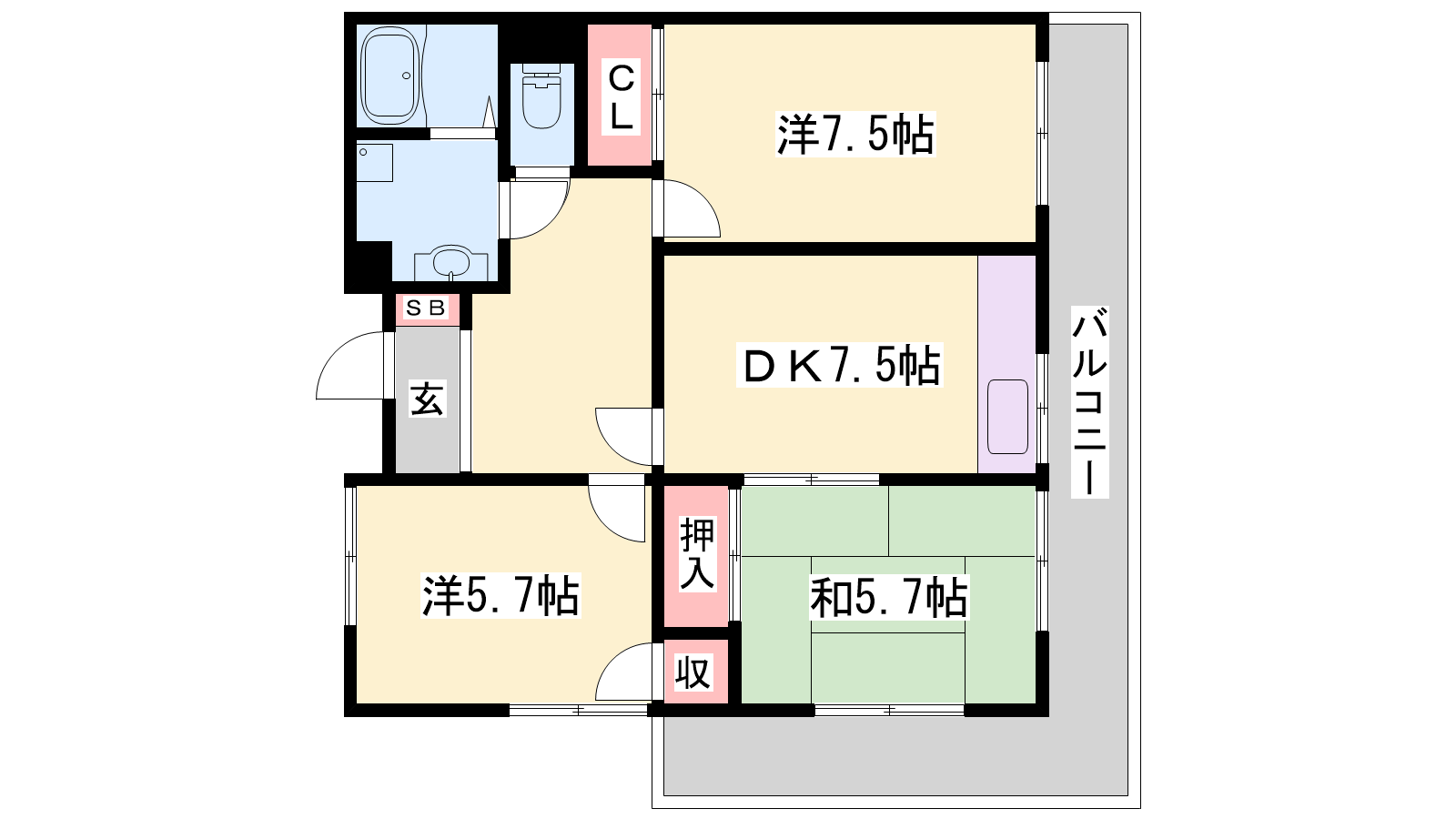 - DK7.5帖、洋室7.3帖、洋室5.7帖、和室5.7帖