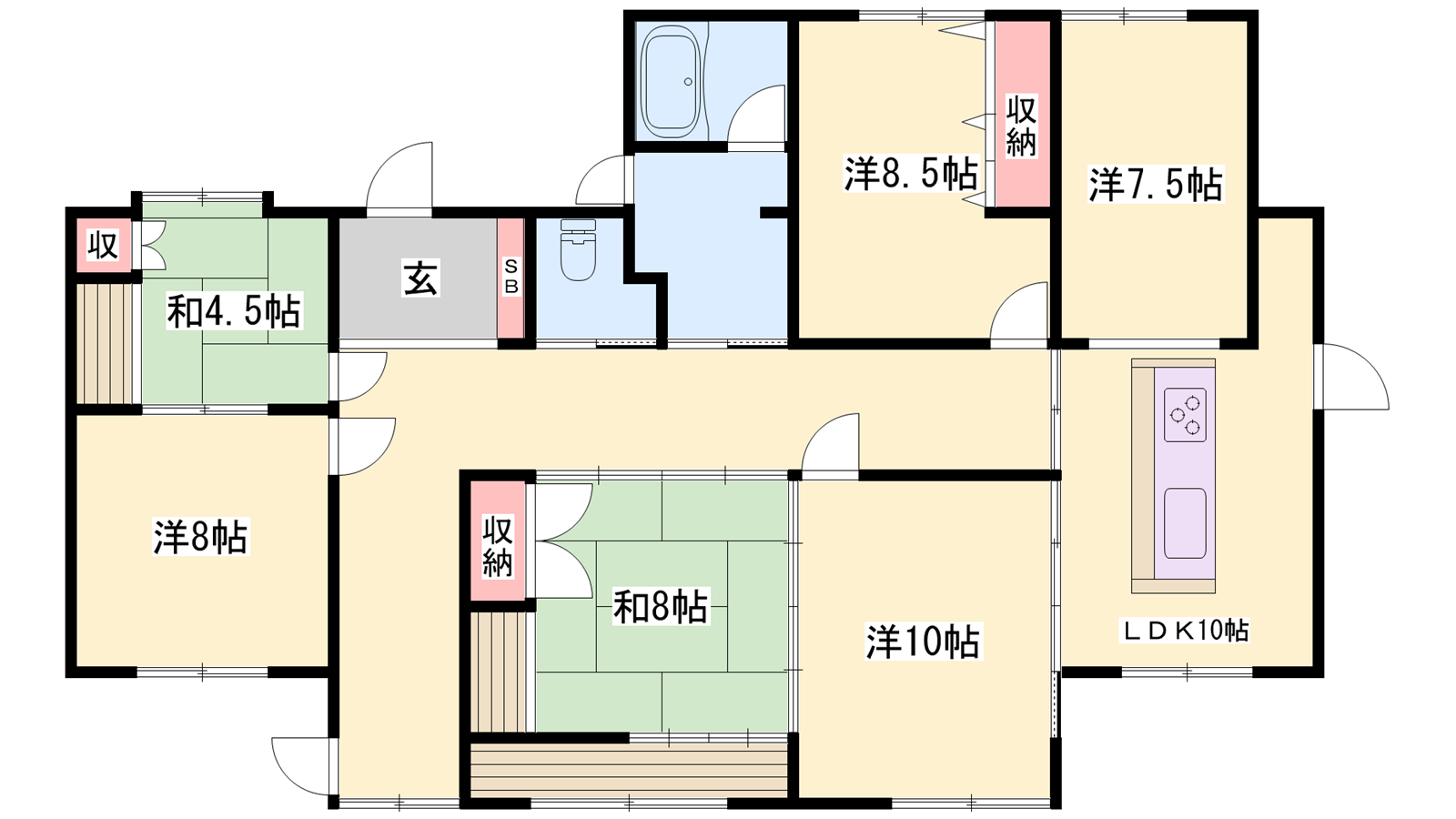 - LDK10帖、洋室10帖、洋室8.5帖、洋室8帖、洋室7.5帖、和室8帖、和室4.5帖