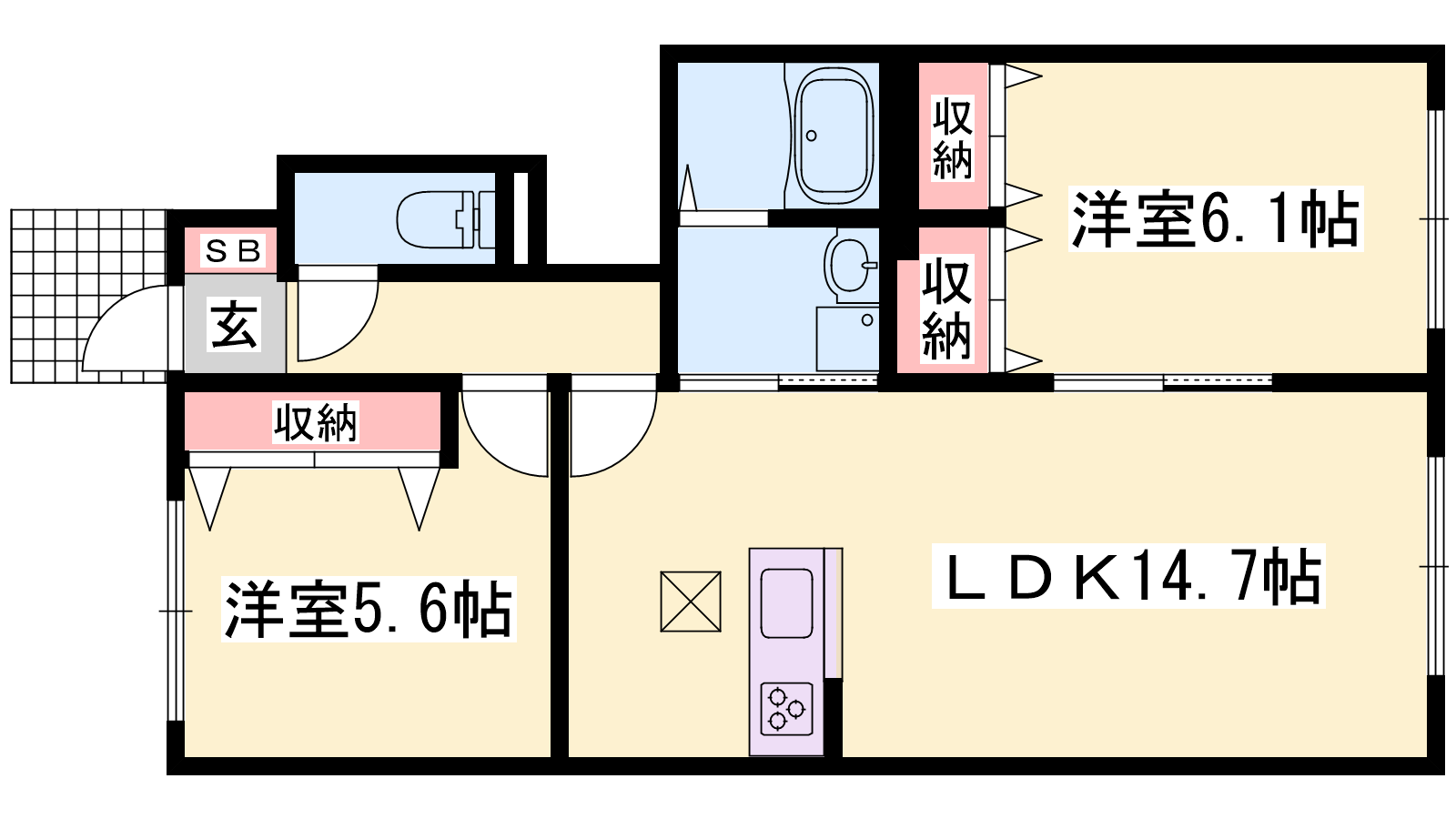 - LDK14.7帖、洋室5.6帖、洋室6.1帖