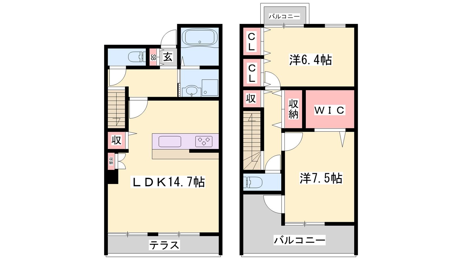 - LDK14.7帖、洋室7.5帖、洋室6.4帖