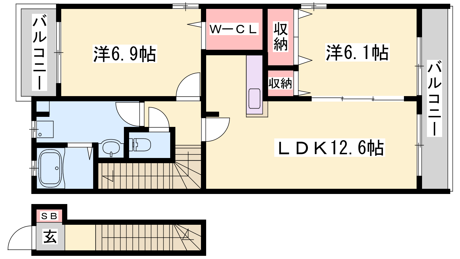 - LDK12.6帖、洋室6.9帖、洋室6.1帖