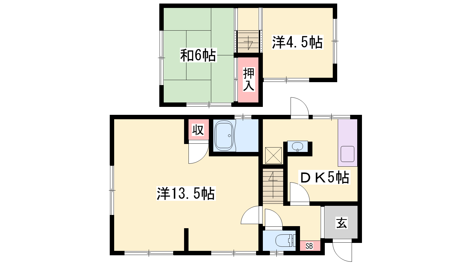 - DK5帖、洋室13.5帖、洋室4.5帖、和室6帖