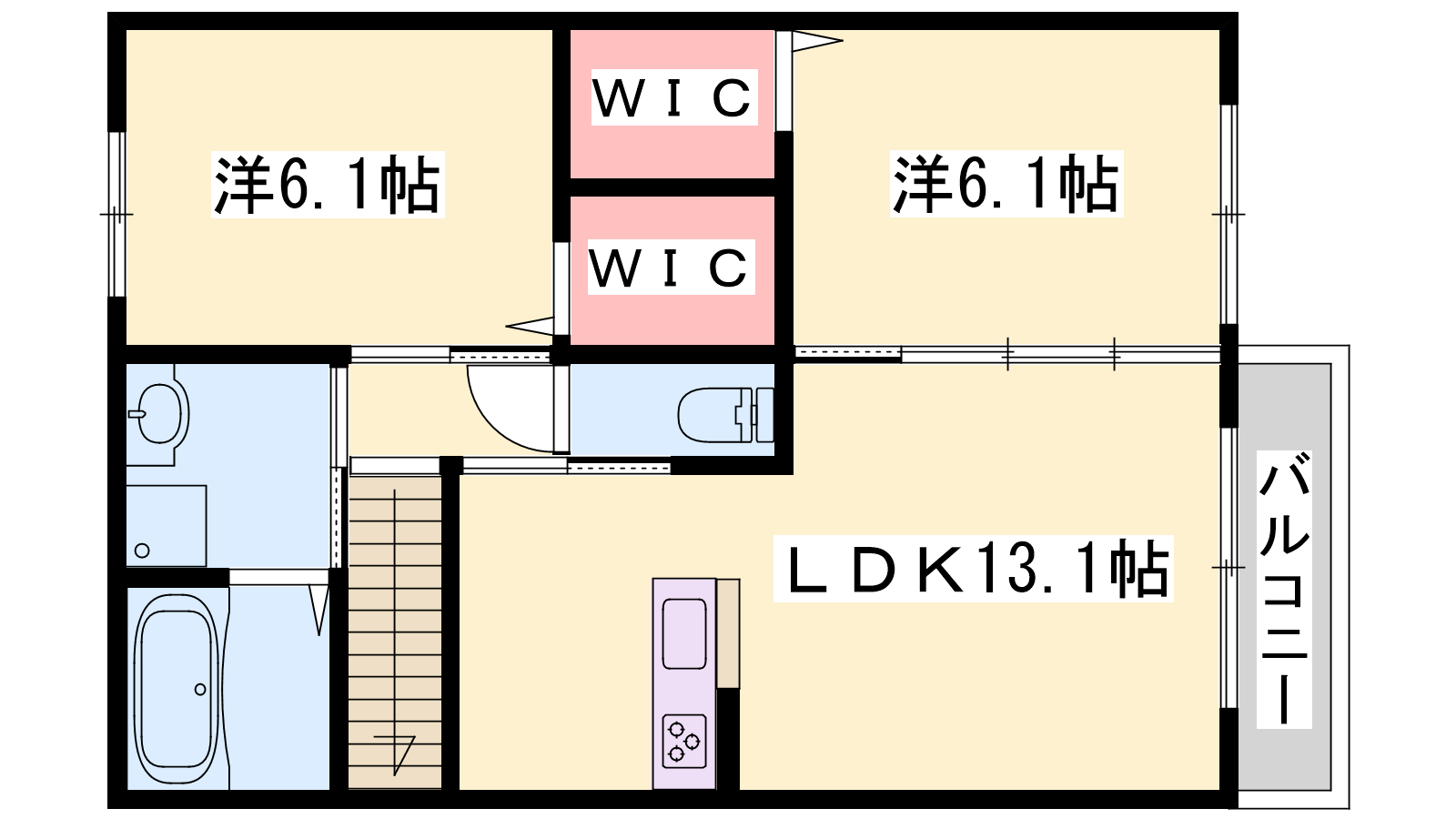 - LDK13.1帖、洋室6.1帖、洋室6.1帖