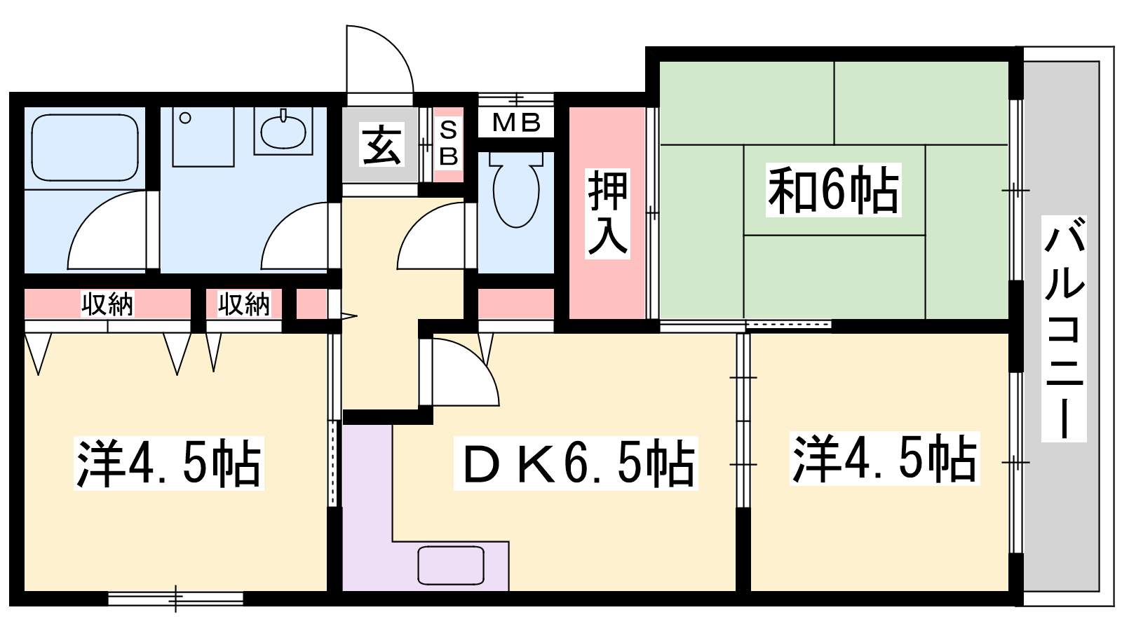- LDK6.5帖、洋室4.5帖、洋室4.5帖、和室6帖