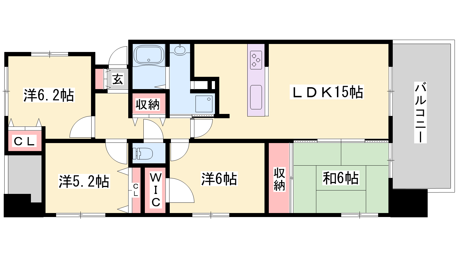 - LDK15帖、洋室6.2帖、洋室6帖、洋室5.2帖、和室6帖