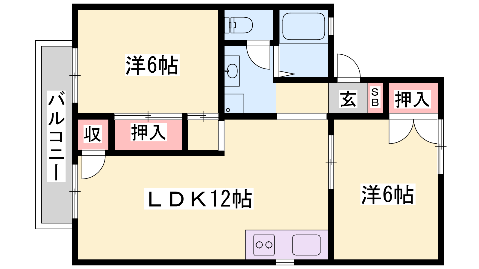 - LDK12帖、洋室6帖、洋室6帖