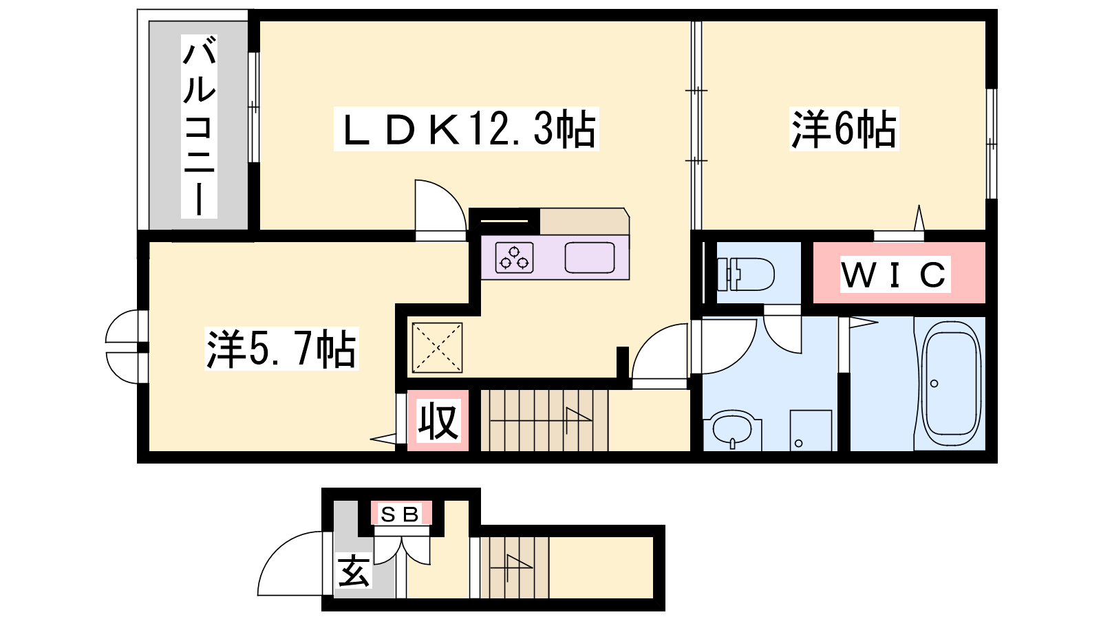- LDK12.3帖、洋室6帖、洋室5.7帖
