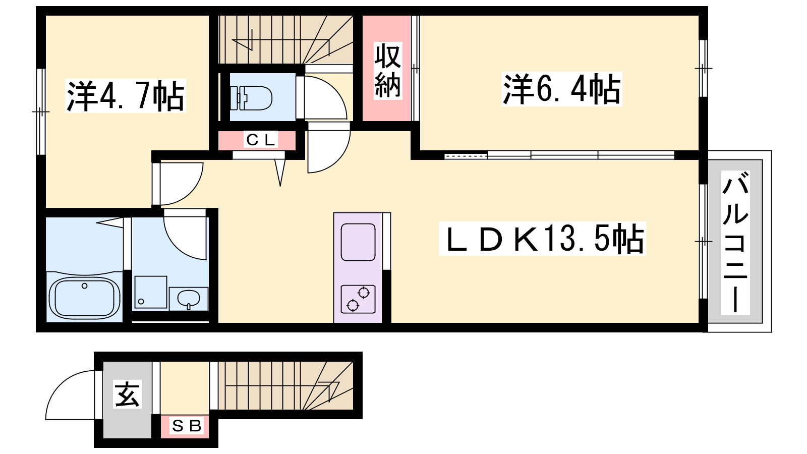 - LDK13.5帖、洋室6.4帖、洋室4.7帖