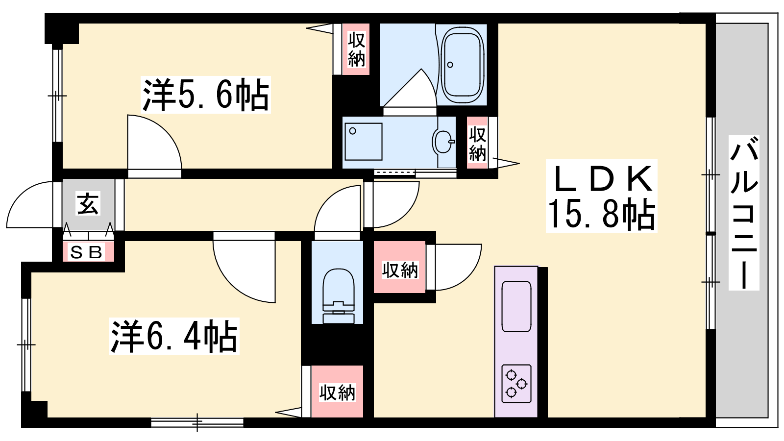 - LDK15.8帖、洋室6.4帖、洋室5.6帖