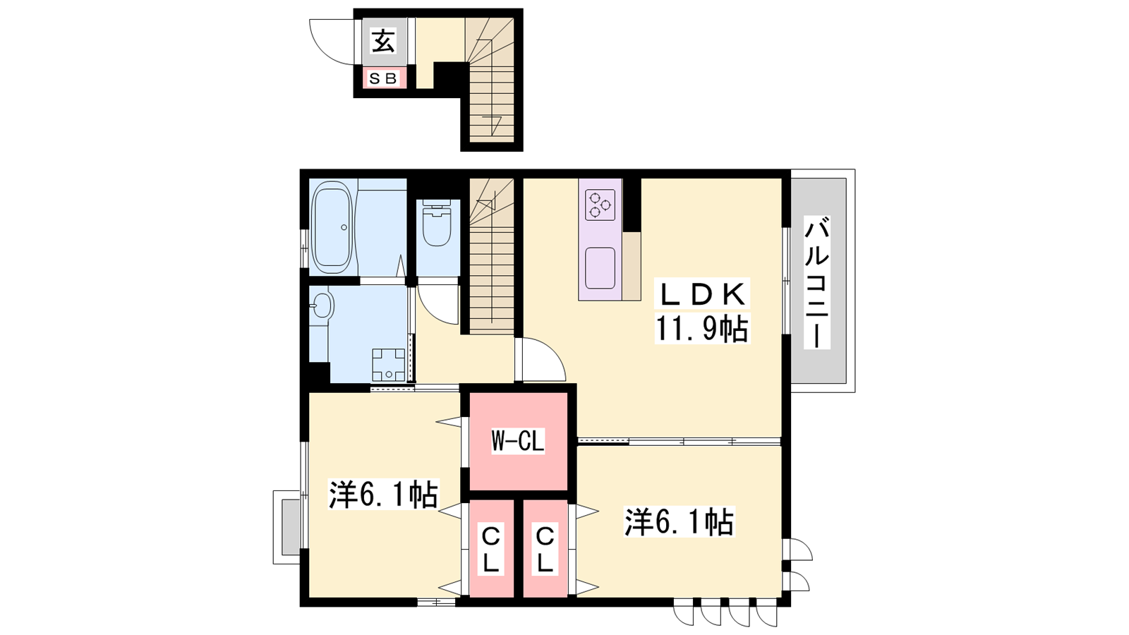 - LDK11.9帖、洋室6.1帖、洋室6.1帖