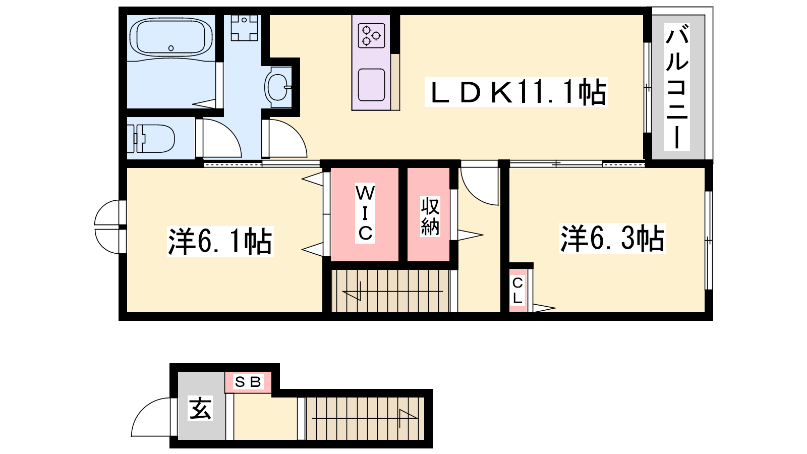 - LDK11.1帖、洋室6.3帖、洋室6.1帖