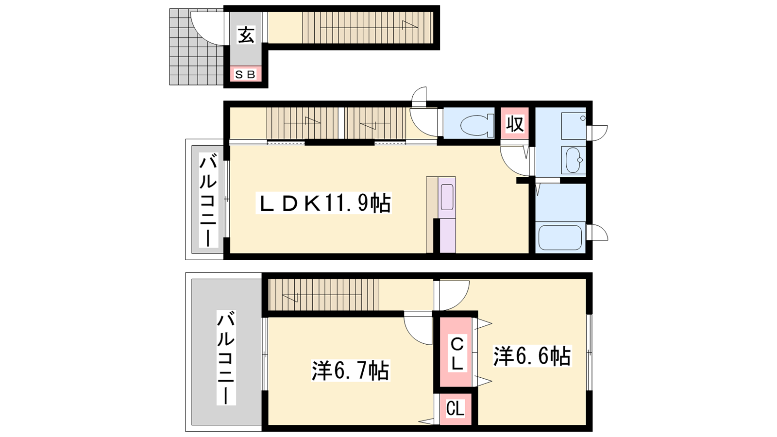 - LDK12帖、洋室6.6帖、洋室6.7帖