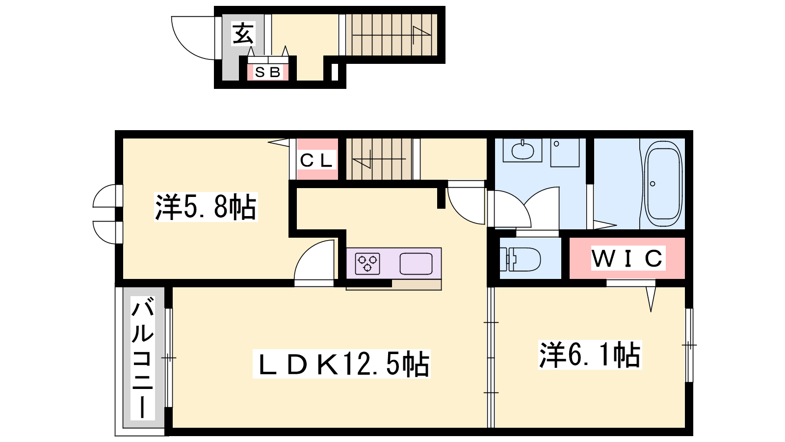 - LDK12.5帖、洋室6.1帖、洋室5.8帖