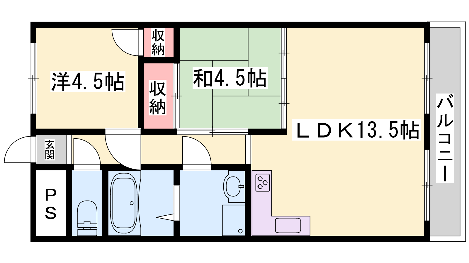 - LDK13.5帖、洋室4.5帖、和室4.5帖
