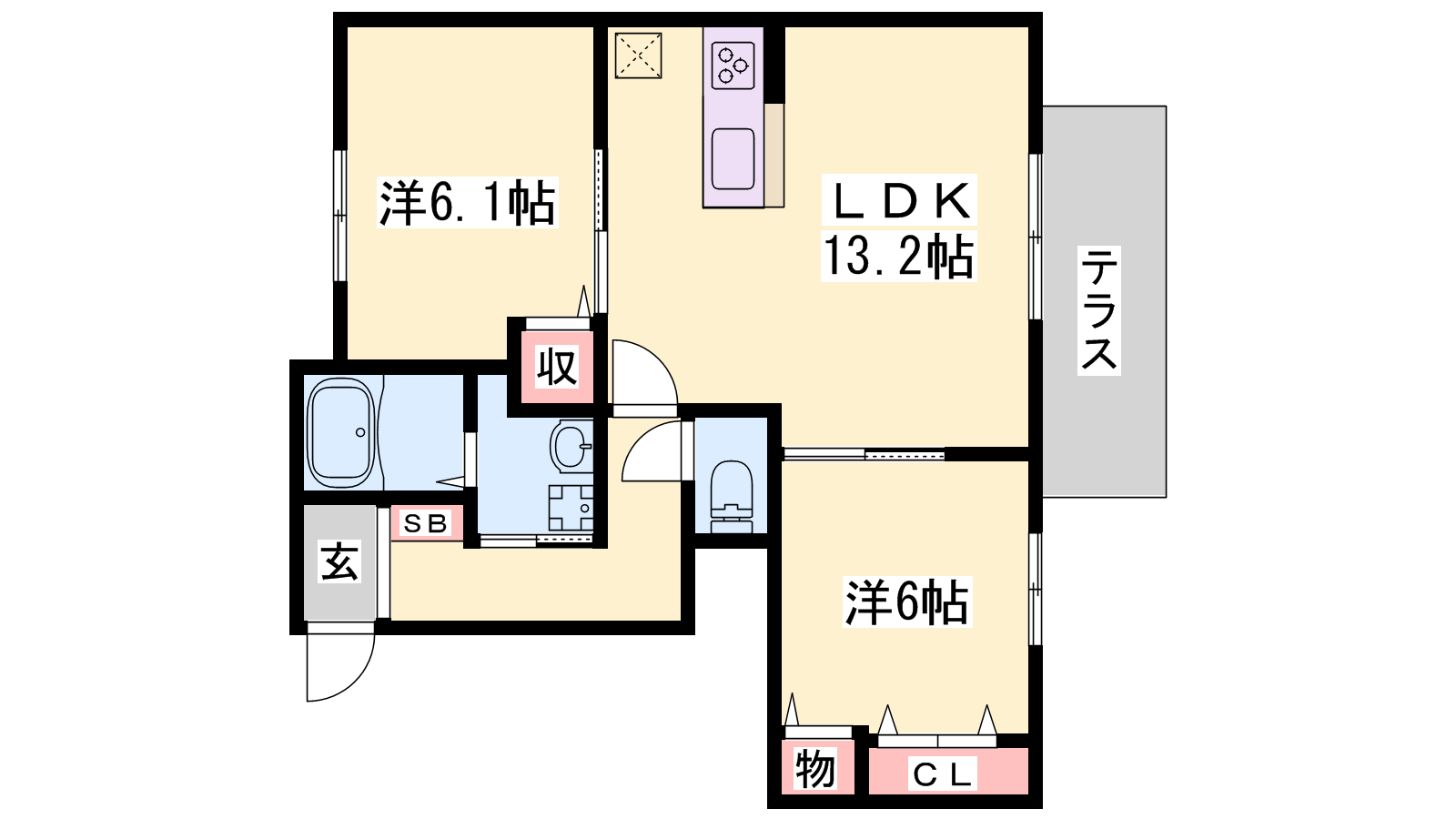 - LDK13.2帖、洋室6.1帖、洋室6帖
