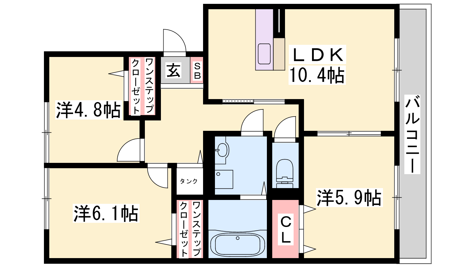 - LDK10.4帖、洋室6.1帖、洋室5.9帖、洋室4.8帖