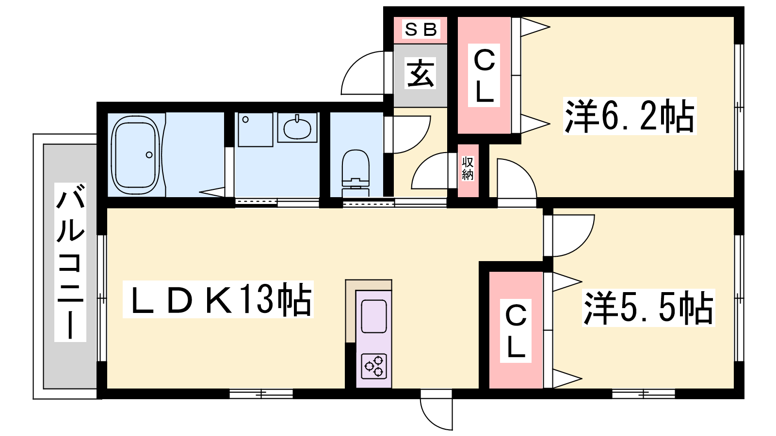 - LDK13帖、洋室6.2帖、洋室5.5帖