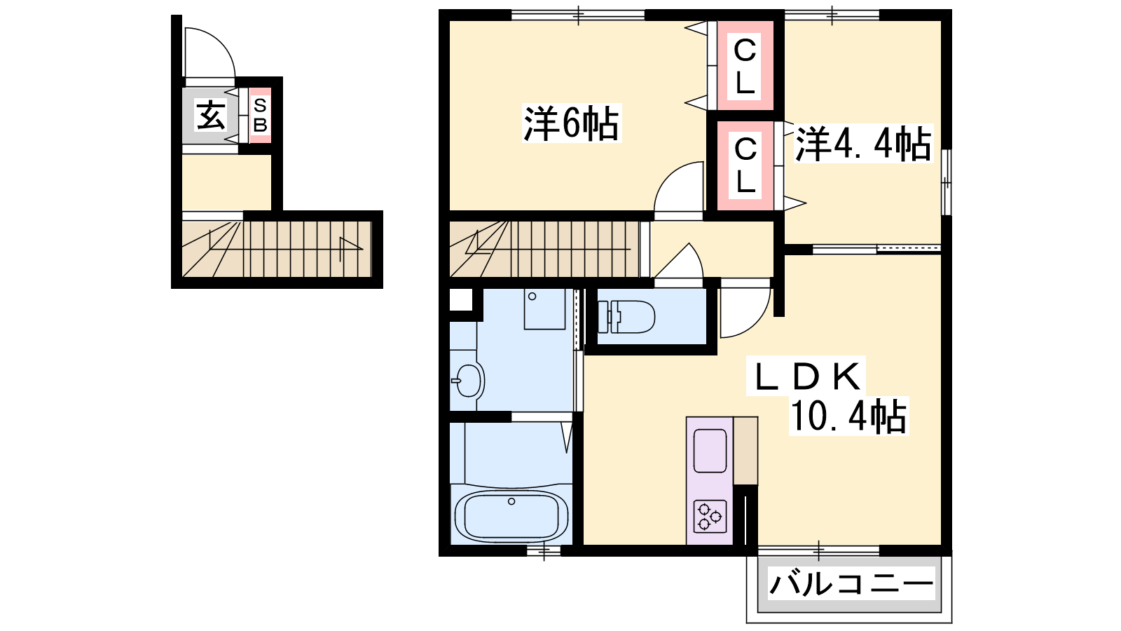 - LDK10.4帖、洋室6帖、洋室4.4帖