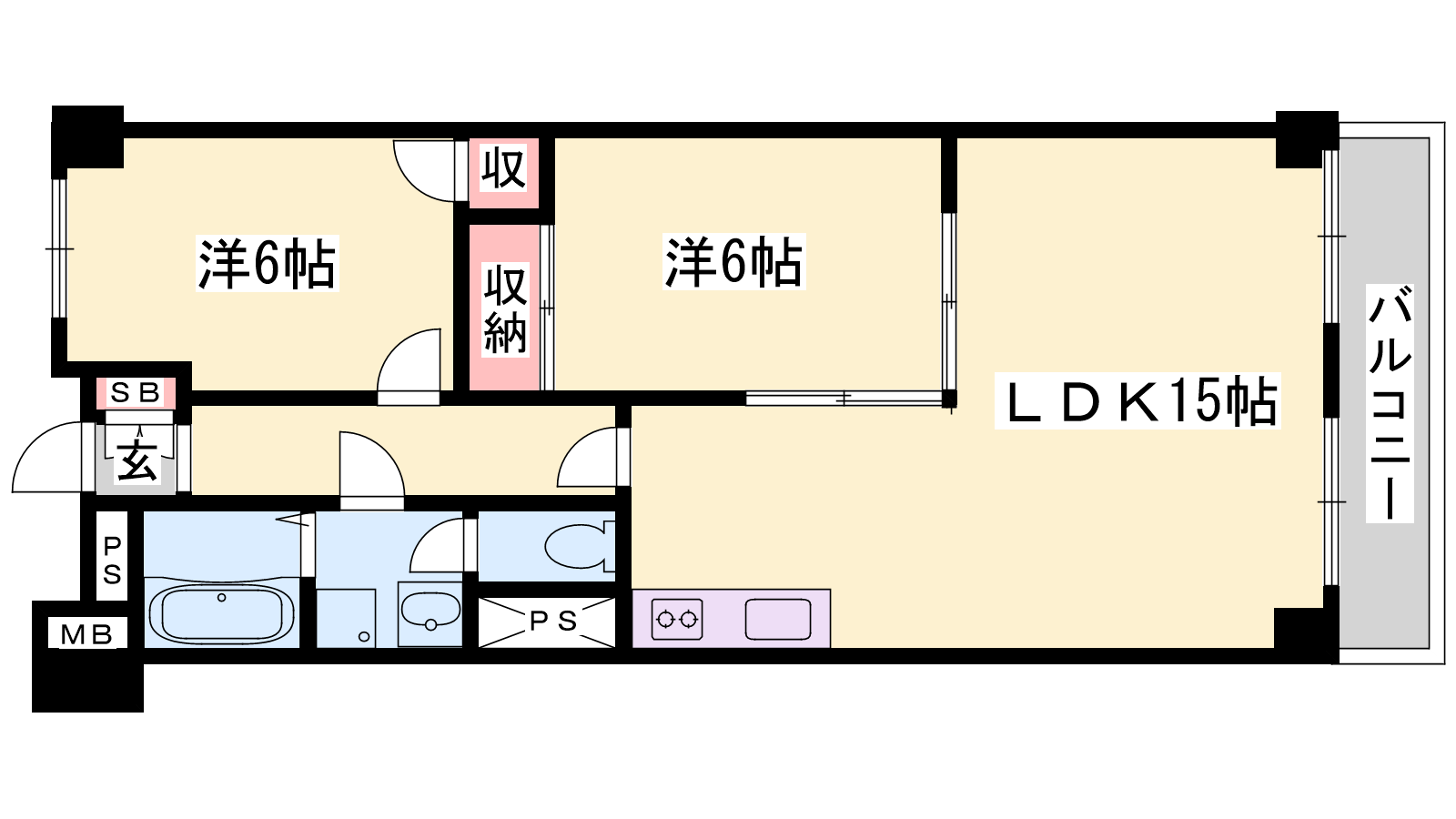 - LDK15帖、洋室6帖、洋室6帖