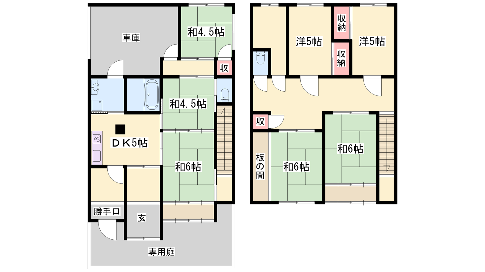 - DK5帖、和室6帖、和室6帖、和室6帖、洋室5帖、洋室5帖、和室4.5帖、和室4.5帖