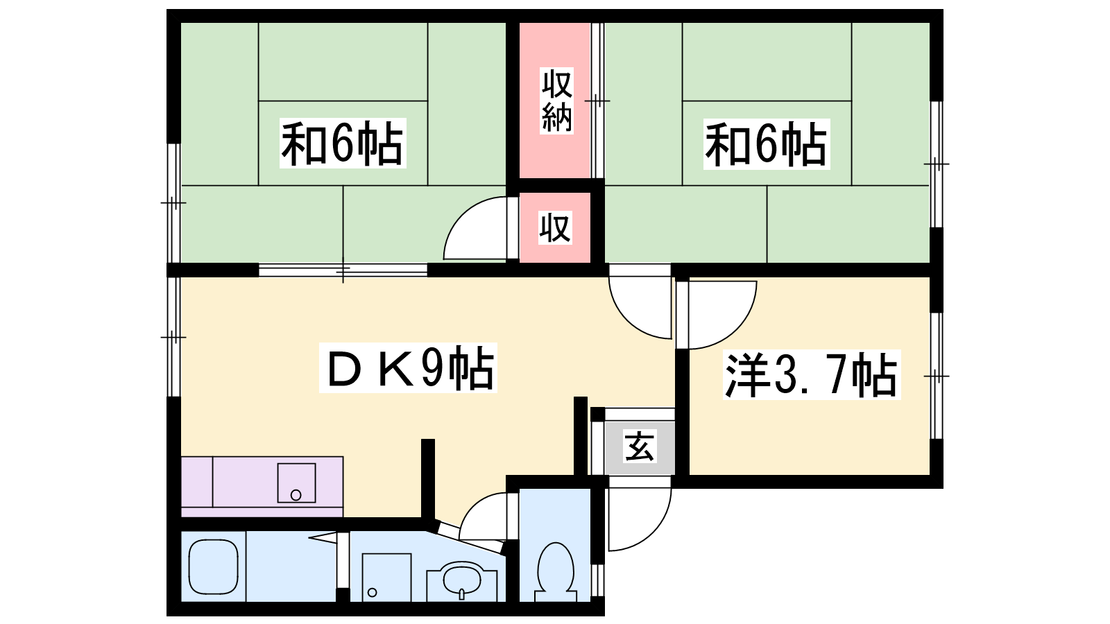 - DK9帖、和室6帖、和室6帖、洋室3.7帖