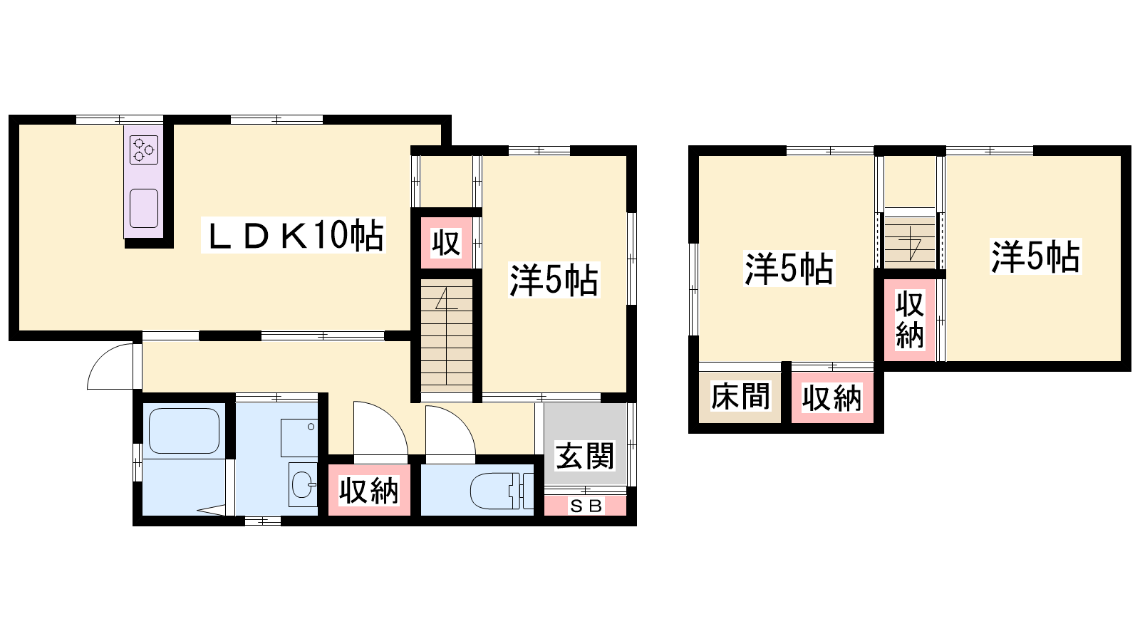 - LDK10帖、洋室5帖、洋室5帖、洋室5帖