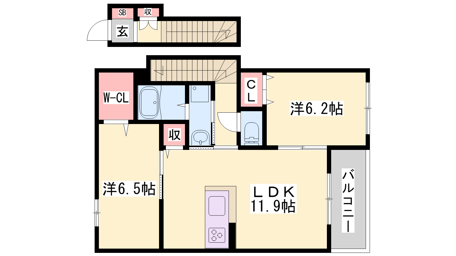 - LDK11.9帖、洋室6.5帖、洋室6.2帖