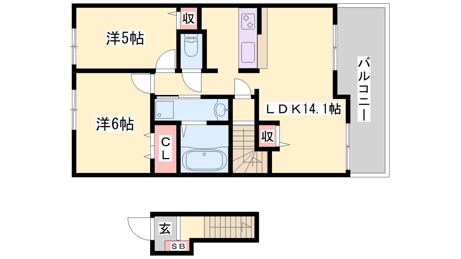 - LDK14帖、洋室6帖、洋室5帖