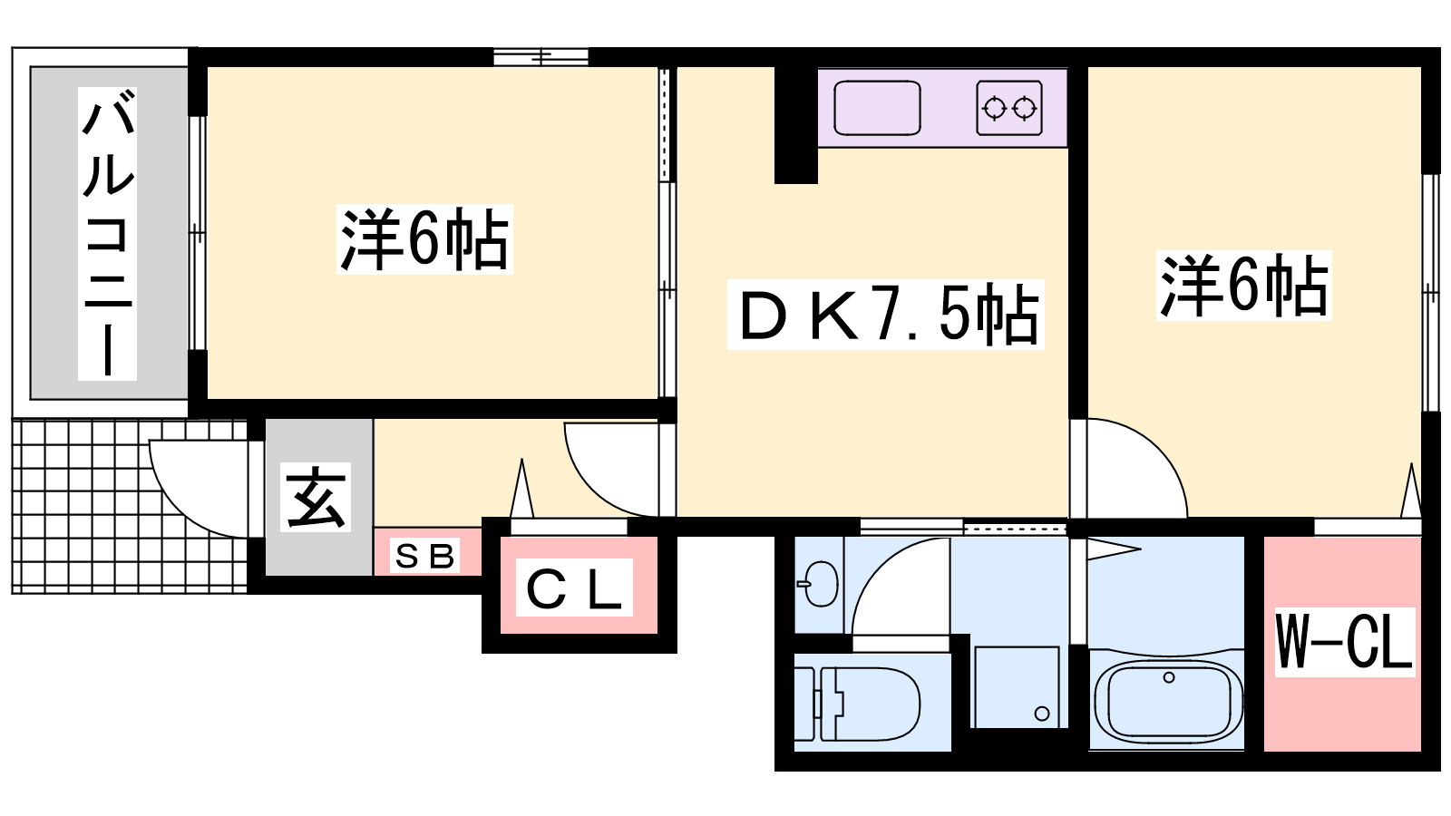 - DK7.5帖、洋室6帖、洋室6帖