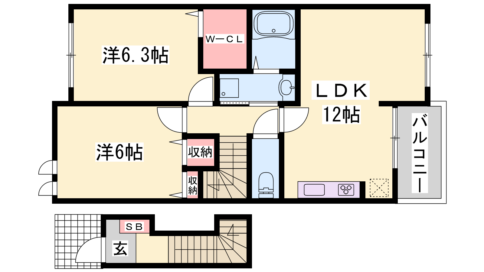 - LDK12帖、洋室6帖、洋室6.3帖