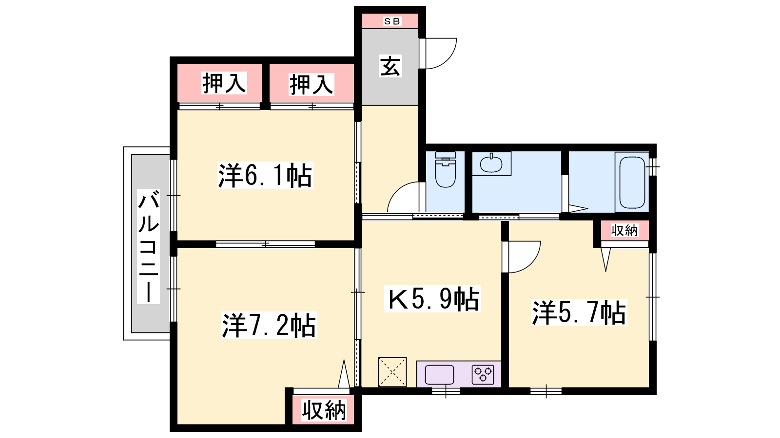 - K5.9帖、洋室7.2帖、洋室6.1帖、洋室5.9帖