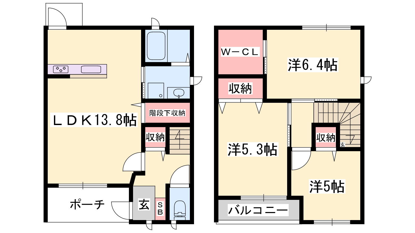 - LDK13.8帖、洋室6.4帖、洋室5.3帖、洋室5帖