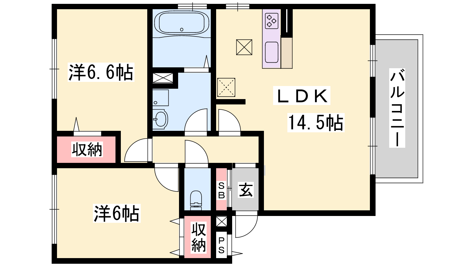 - LDK14.5帖、洋室6帖、洋室6.6帖