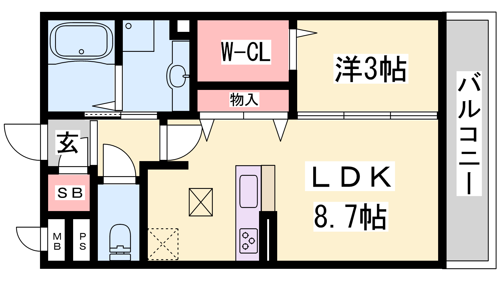 - LDK8.7帖、洋室3帖