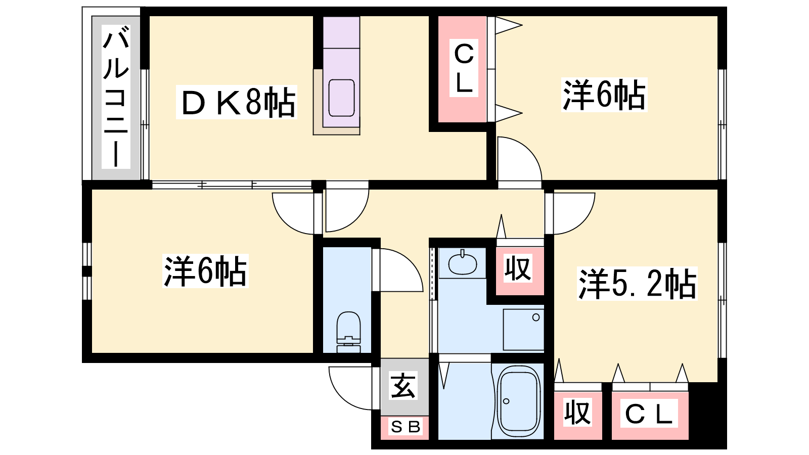 - DK8帖、洋室6帖、洋室6帖、洋室5.2帖