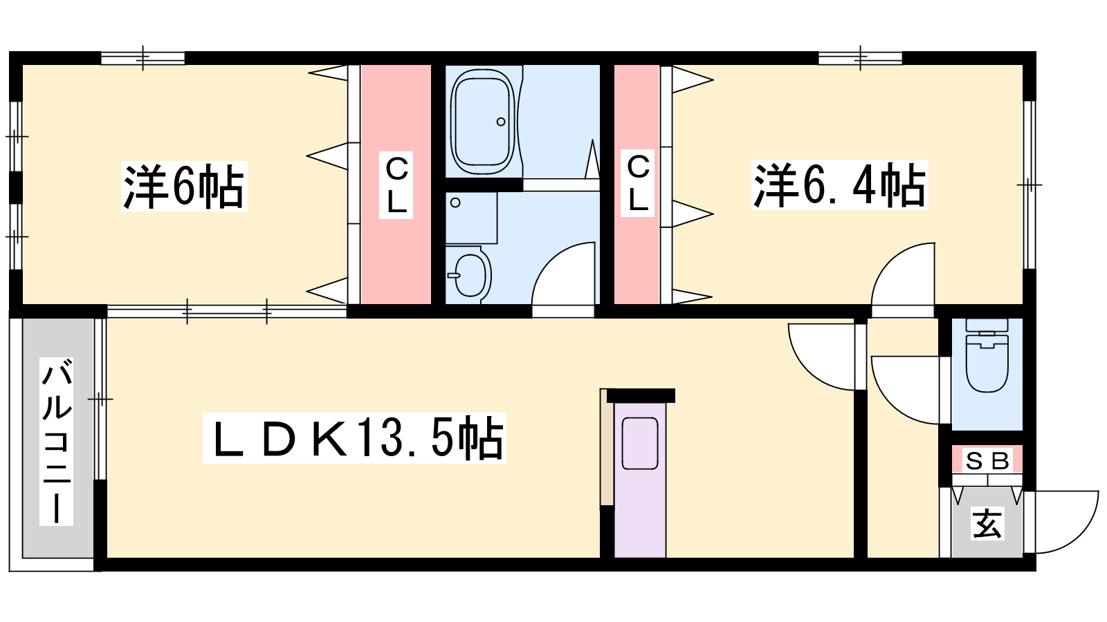 - LDK13.5帖、洋室6.4帖、洋室6帖