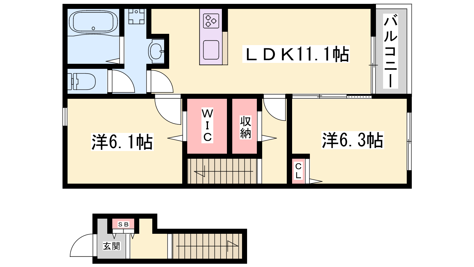 - LDK11.1帖、洋室6.3帖、洋室6.1帖
