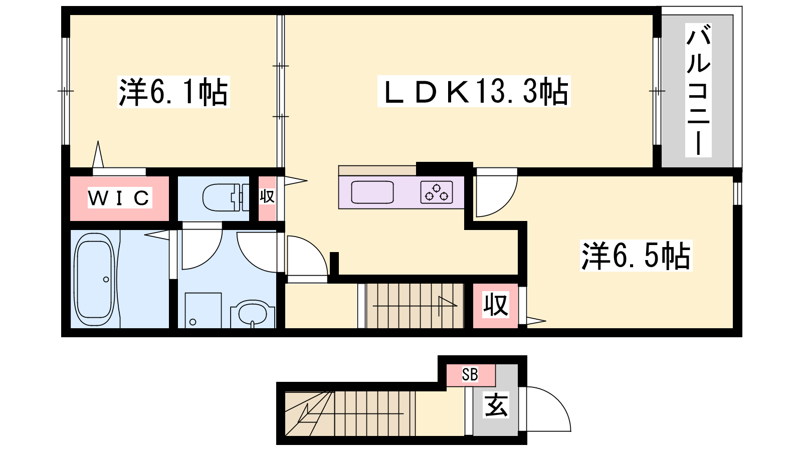 - LDK13.3帖、洋室6.5帖、洋室6.1帖
