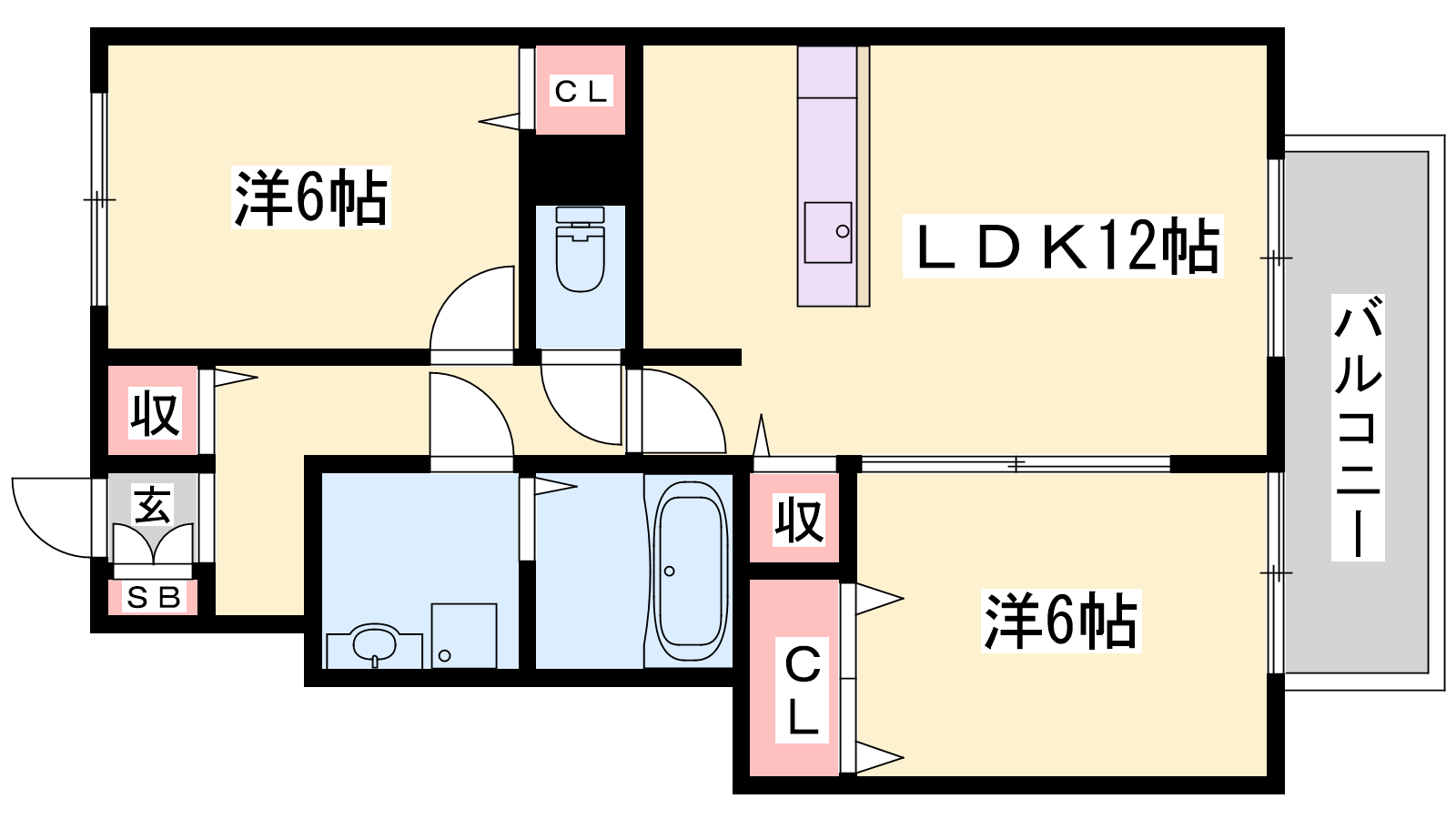 - LDK12帖、洋室6帖、洋室6帖